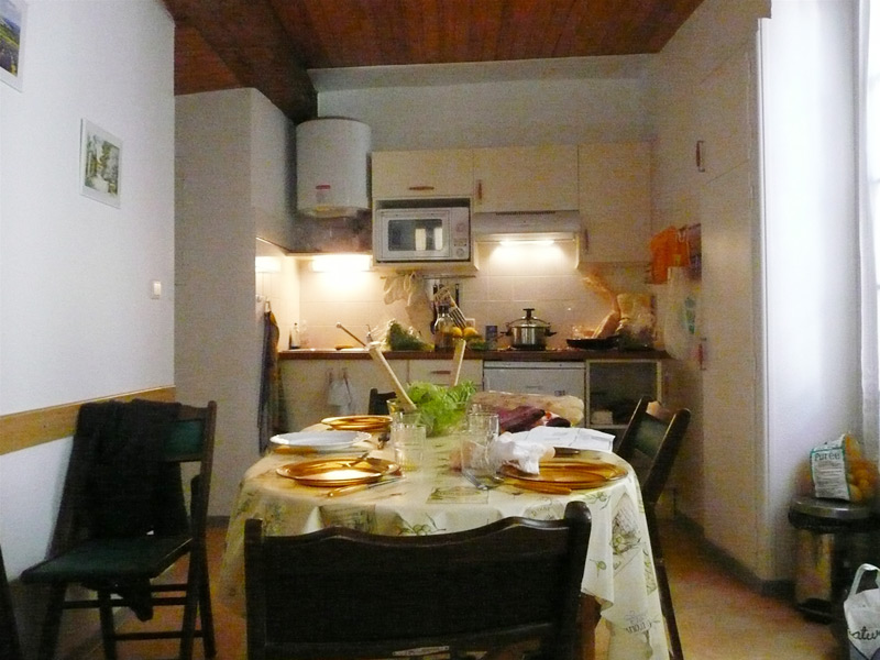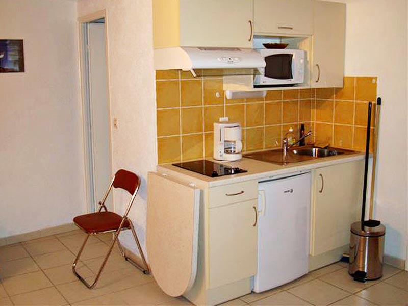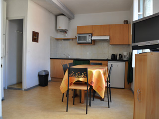 - coin cuisine (table vitrocéramique 2 feux, micro ondes et réfrigérateur)